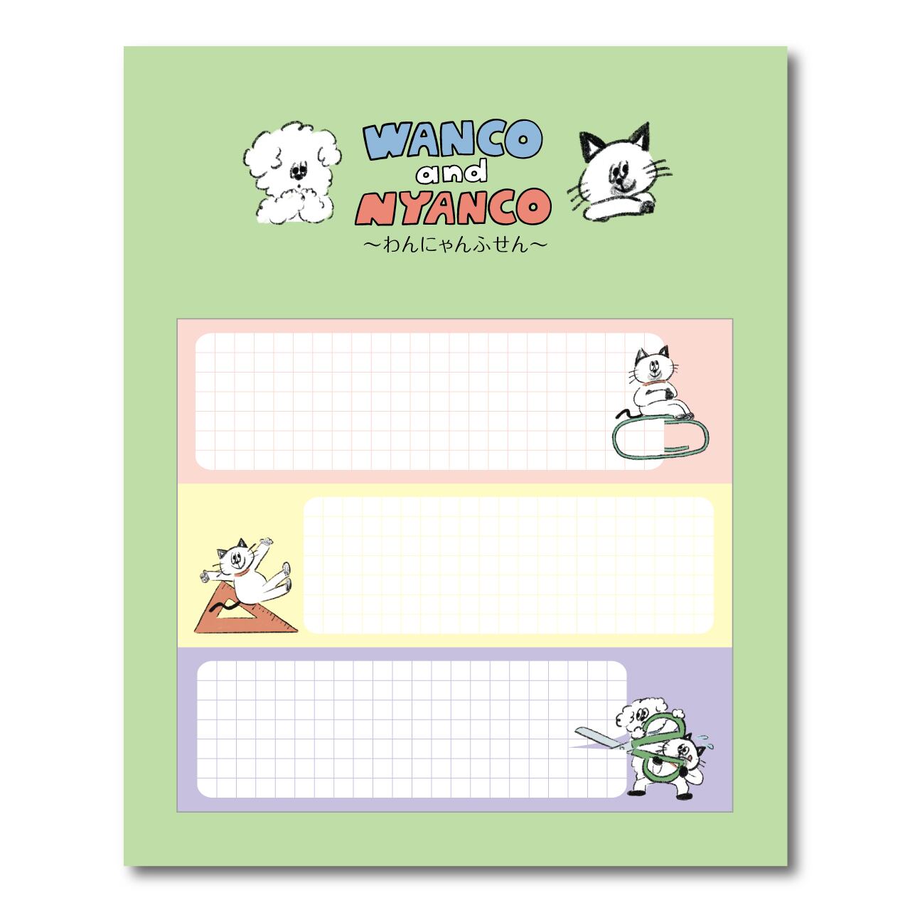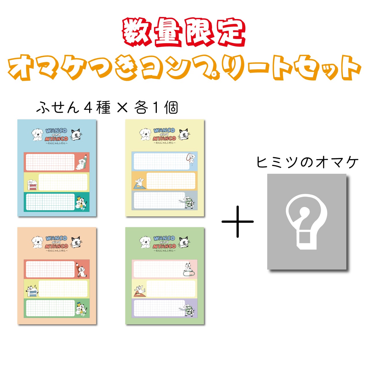 わんにゃんと文房具のデザインがプリントされた付箋(全4種)のコンプリートセットです。